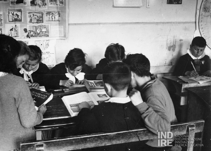 Sul retro della foto è riportata la seguente descrizione: "Ricerche collettive: oltre alle indagini individuali, vengono effettuate anche ricerche collettive. L'idea della ricerca viene quasi sempre suggerita dagli stessi alunni, ma non manca il caso in cui io stesso assegno argomenti diversia gruppi di alunni, tenendo conto delle possibilità che può loro offrire l'ambiente in cui vivono. Le fonti delle ricerche sono le più disparate: osservazioni dirette, libri, enciclopedie, giornali, ecc. Capita spesso che un ragazzo, il quale non ha visto trionfare il suo tema libero nel corso della votazione, si cerca dei collaboratori per essere aiutato a sviluppare meglio la traccia del suo tema il quale, in questo caso, porterà le firme di tutti gli autori. Dopo questa rielaborazione il tema viene nuovamente sottoposto al giudizio mio ed a quello di tutta la scolaresca". La foto è stata scattata alla Scuola Elementare "G. e G. Iacobucci" di Campobasso: gli alunni sono alle prese con una ricerca collettiva in classe.